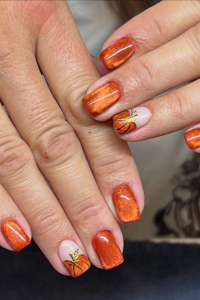 You can add autumn sparkle with copper-orange shimmer and subtle pumpkin accents.