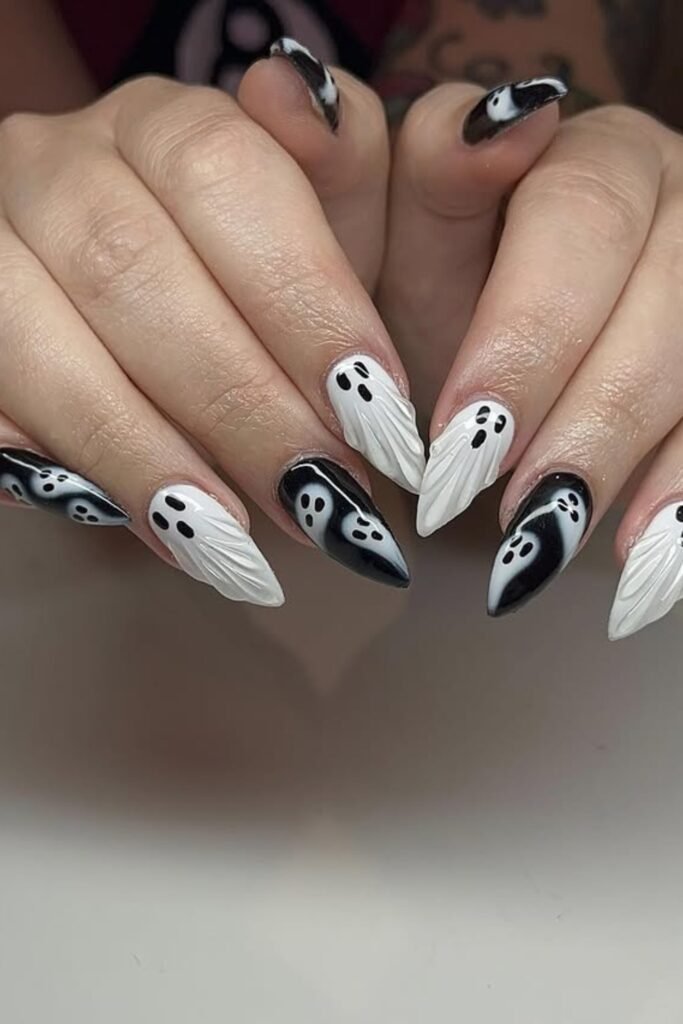 You take Halloween charm to another level with raised white ghost textures on alternating black-and-white nails.