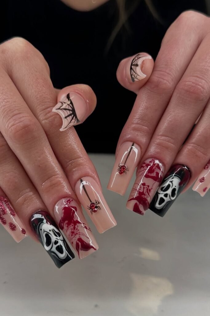You make your nails stand out by pairing Scream mask art with glossy blood-drip details and 3D red spiders.