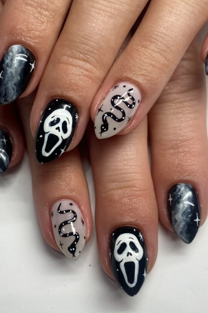 You mix eerie and chic by combining smoky marble nails with black serpent art and Scream mask details.