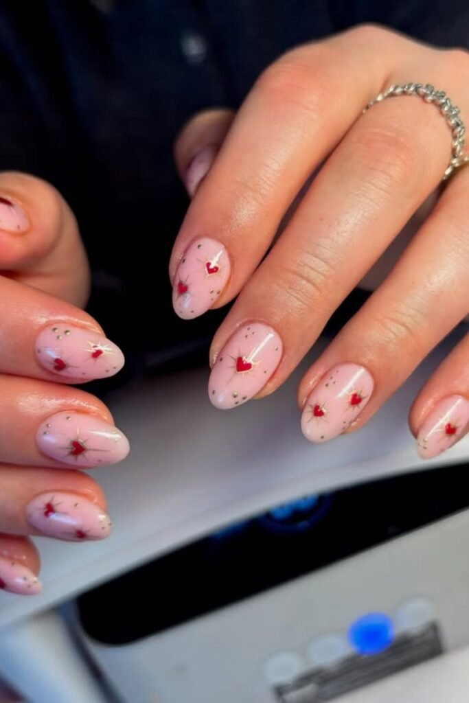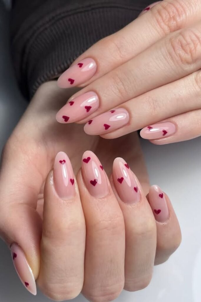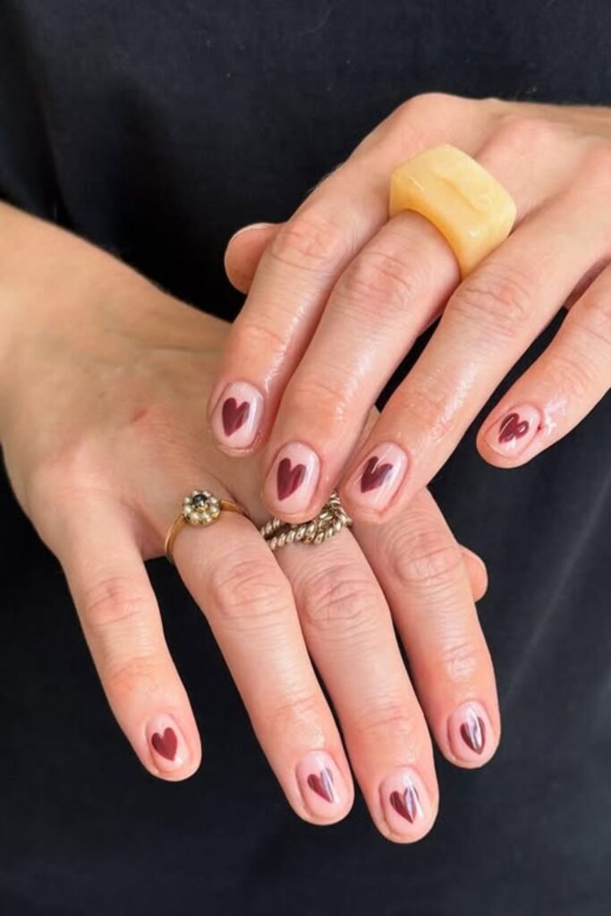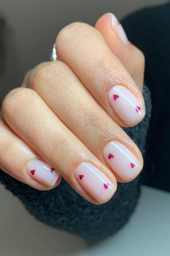 You can start with a sheer pink or nude base, then place the hearts unevenly, some closer to the cuticle, some higher up.