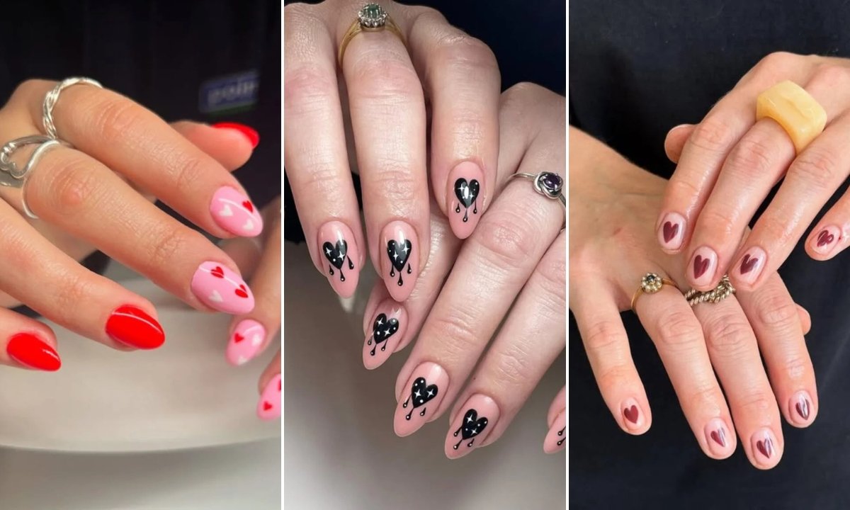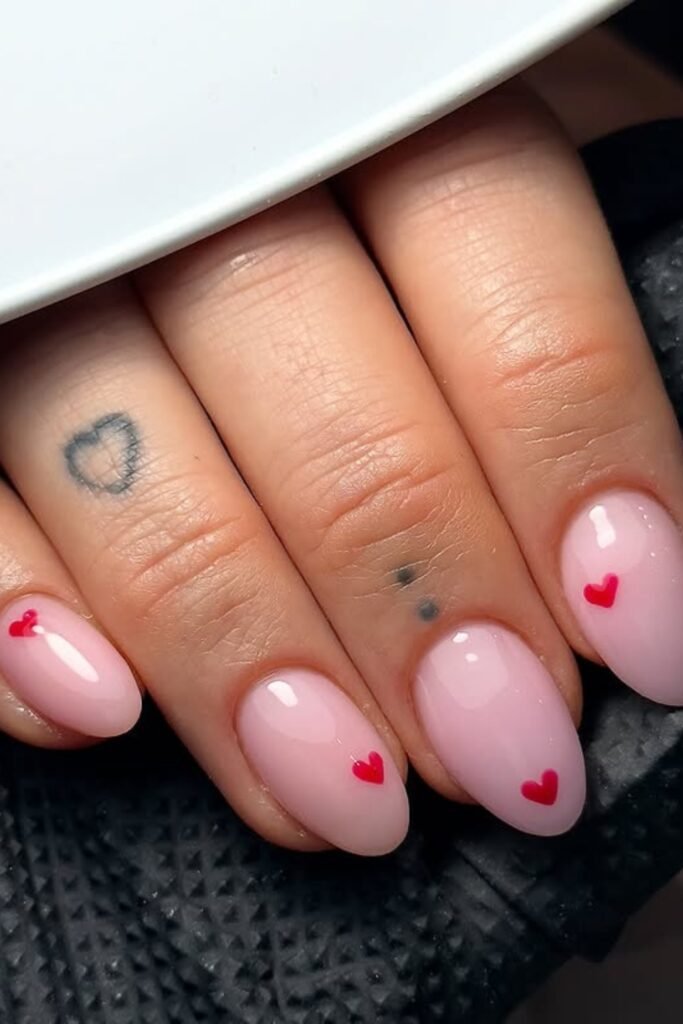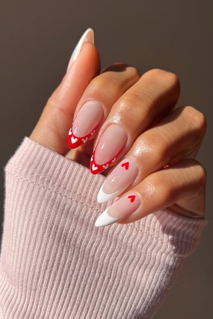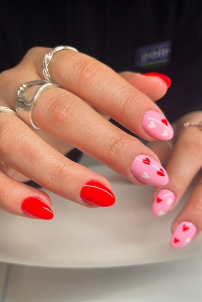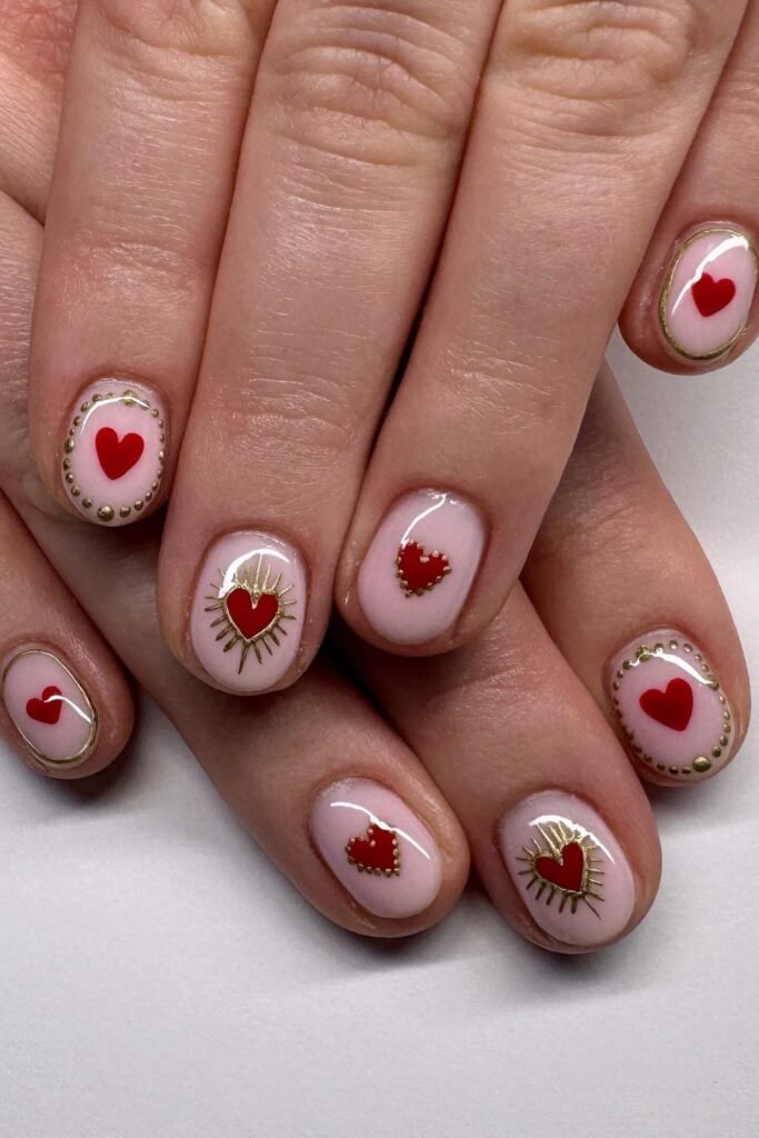 You can paint a few nails in bold red, then use a softer pink base for your heart accents so they pop without feeling loud.