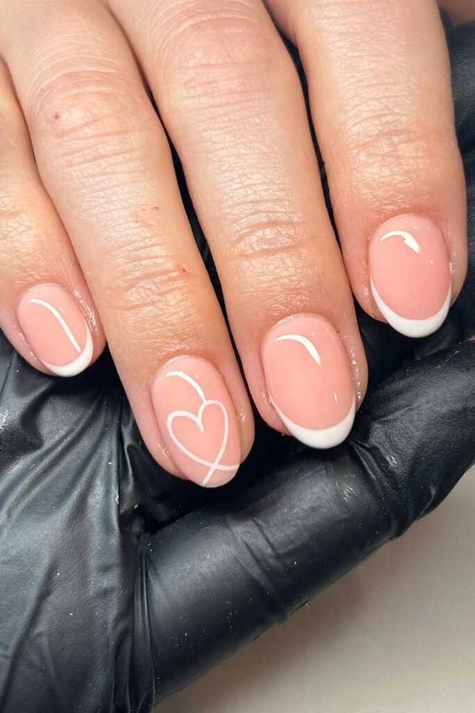 You can start with a blush or milky pink base and classic French tips, then you slowly draw the heart using a liner brush.