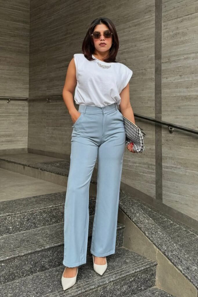 The best option you can go for is fitted clothes in the right places like a structured blazer, a wrap top, and high-waist trousers.