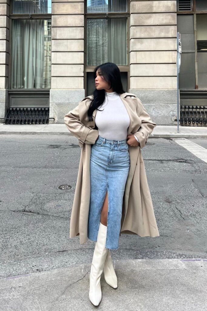 In winter, you can reach for tall leather boots, tights, and long coats to stay warm without losing style.