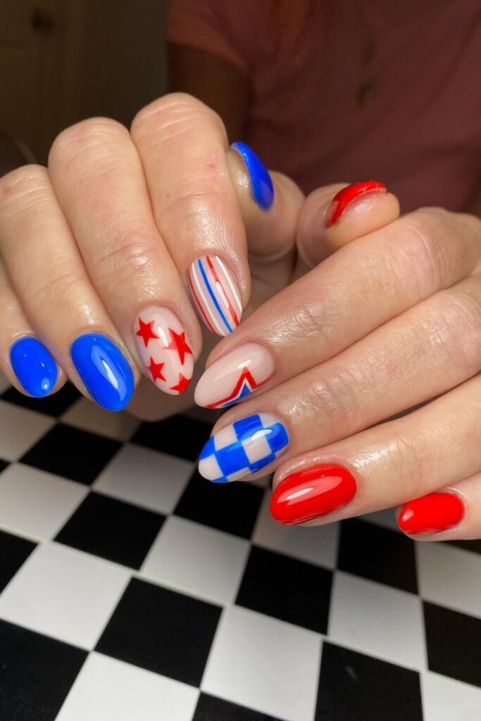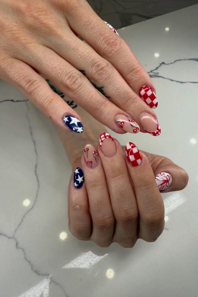 The red checkered nails steal the show, while your navy star accents and tiny red swirls keep everything tied together.