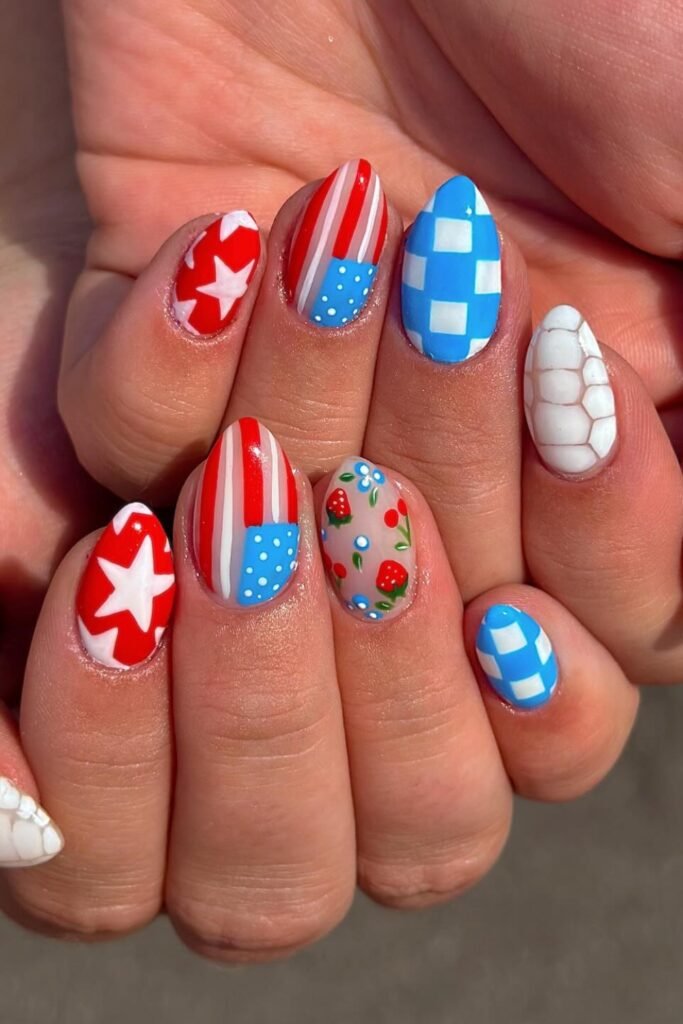 The stars, stripes, blue checkers, and tiny strawberries all bring their own charm, but your soft florals and white texture nails keep everything from feeling too busy.