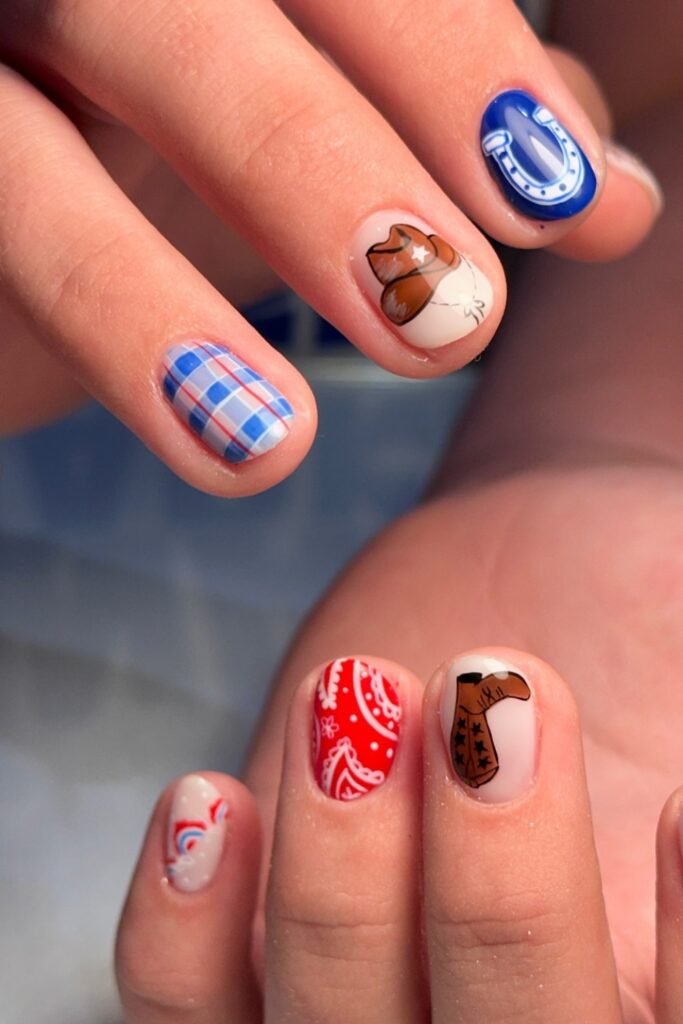 This mix of bandana prints, plaid, boots, and a bold blue horseshoe gives your nails a fun country vibe without feeling heavy.