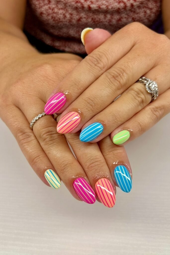 You can paint each nail a solid neon shade, then drag a fine brush across for clean diagonal stripes.