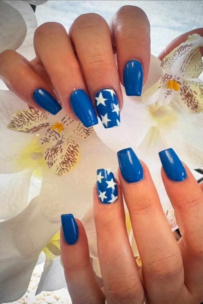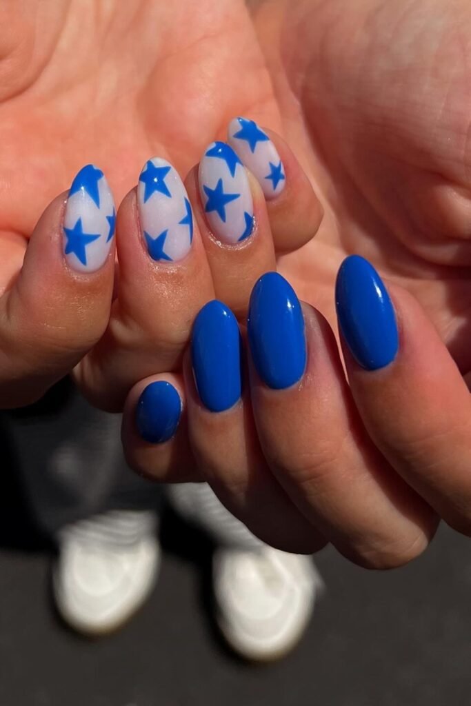The mix of solid blue nails and sheer star accents keeps the design balanced, so it stands out without feeling heavy.