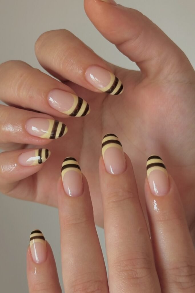 The soft yellow paired with thin black lines gives the nails a subtle bee-inspired edge without feeling too literal.