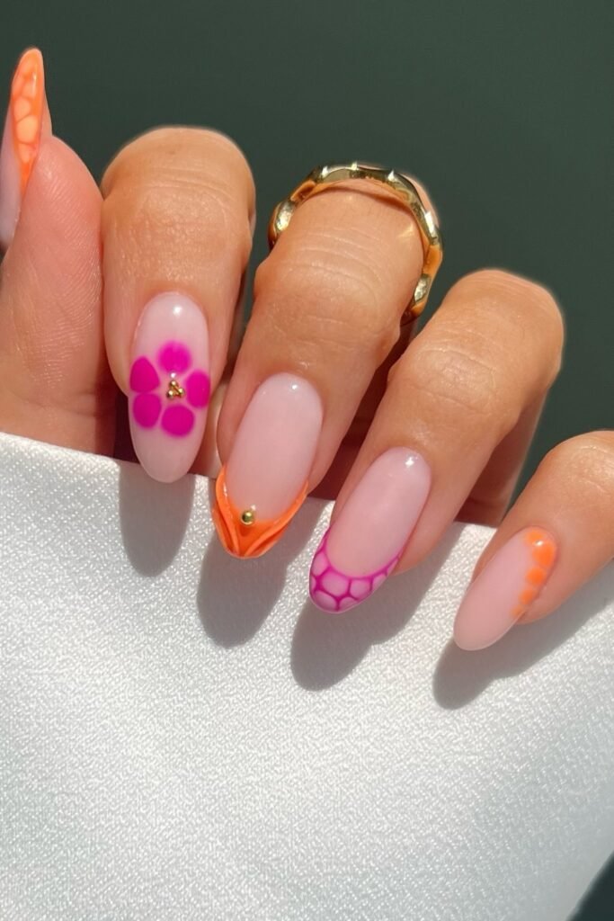 The neon flower, bright orange tips, and pink detailing instantly lift your whole look without making it feel busy.