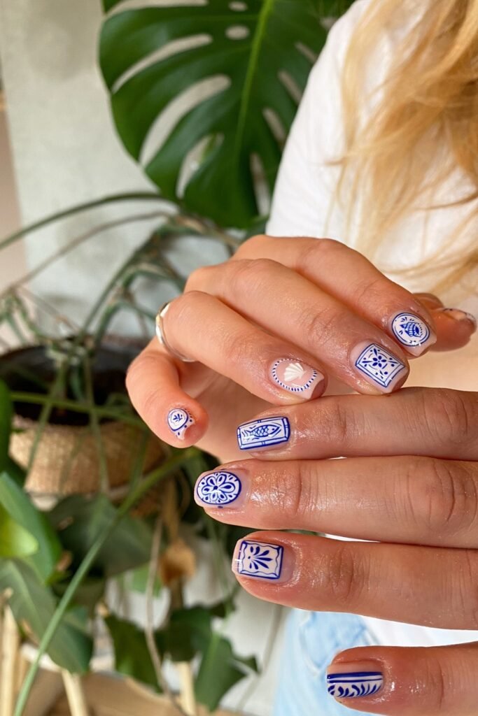 You can start with a soft white base, then use a fine brush or stamping plate for the blue details.