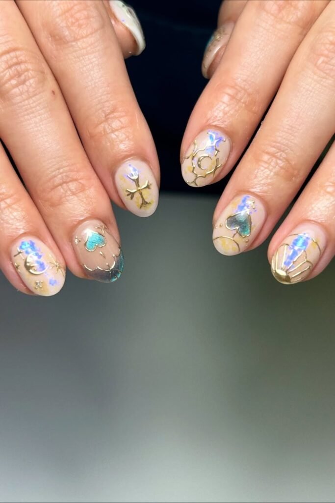You keep everything soft with a sheer nude base, while the gold outlines and tiny hearts give you that delicate, jewelry-like finish.