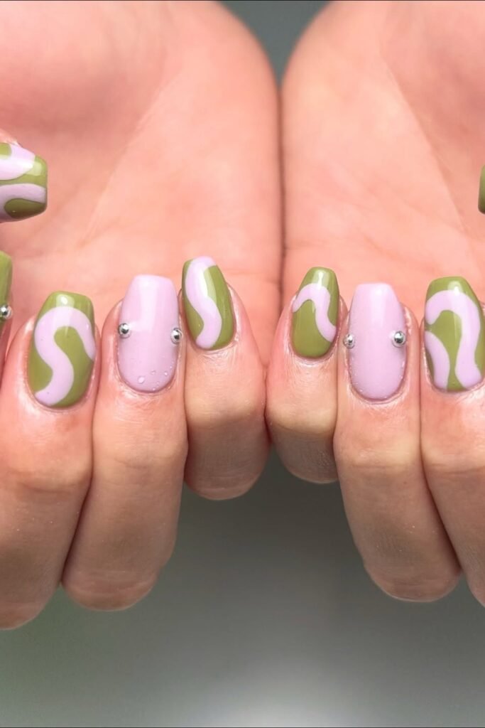 You get a soft retro feel from the wavy lines, and when you add tiny silver studs, the look stays modern.