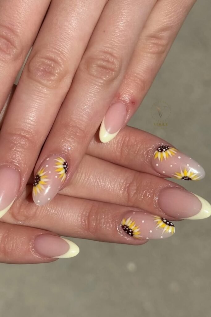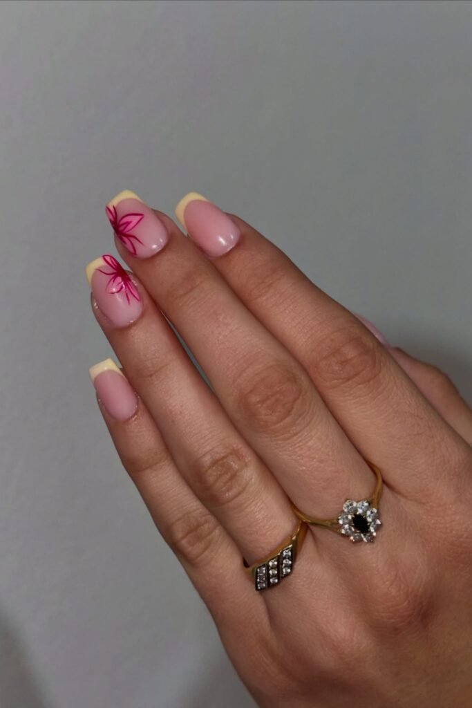 A soft yellow French tip always feels summery, but that bright pink floral burst gives the whole set a playful twist without going overboard.