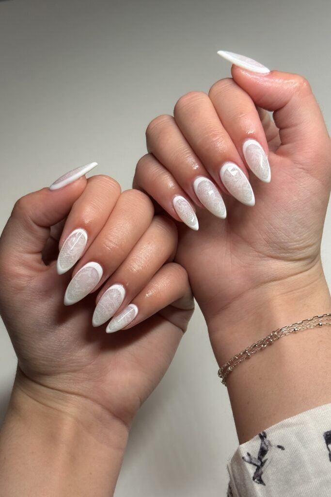You can start with a sheer milky base, paint faint white swirls, then soften them with a sponge so the pattern looks like lace instead of sharp lines.
