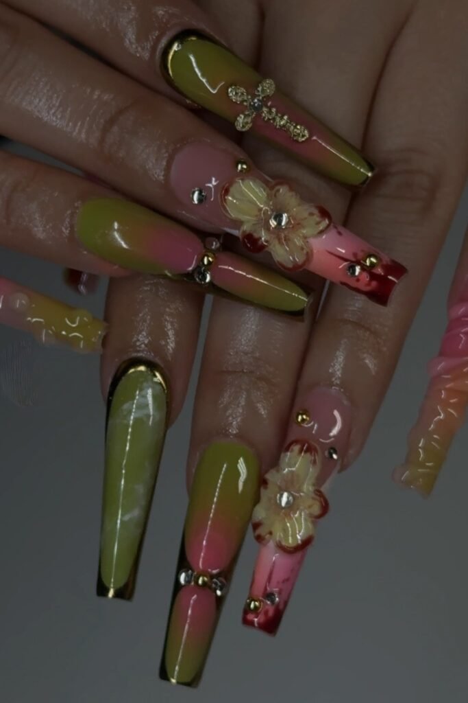 When you want full summer drama, this is where you go, long ombre nails blended in pink, coral, and lime, finished with gold-lined edges that look like luxury jewelry.