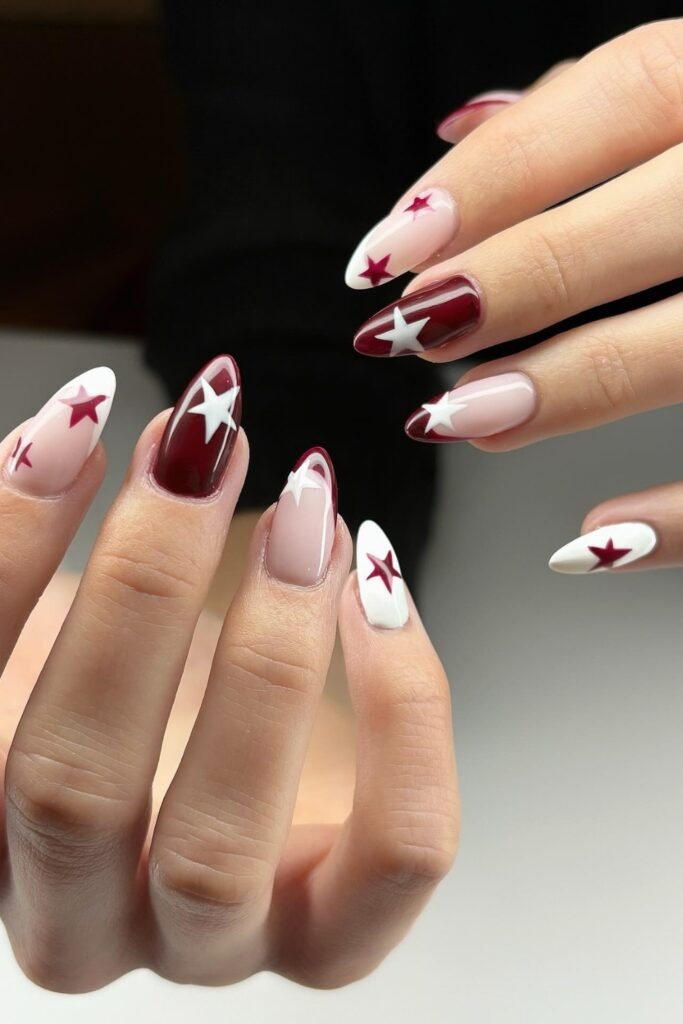 A sharp burgundy tip always steals attention, and adding crisp star accents turns it into the kind of June manicure that stands out at festivals, night events, or any outfit.