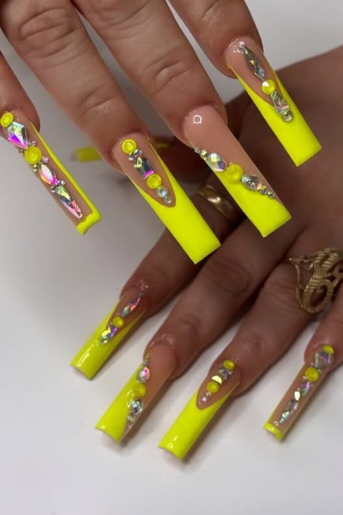 When June hits and you want impact, neon yellow with chunky crystals makes sure your hands get noticed first.