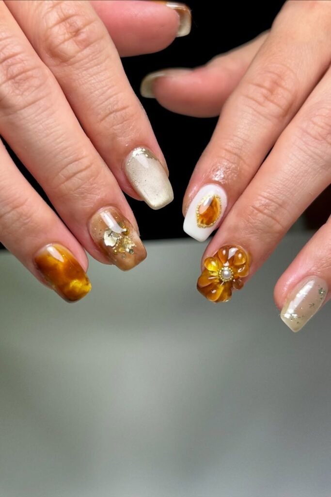 You blend caramel gel with a touch of amber jelly polish, press gold flakes into the tacky layer, and finish with a sculpted gel flower to keep everything balanced and rich.