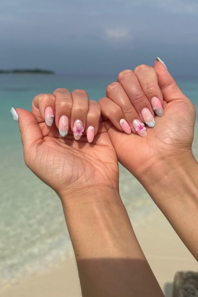 When you pair soft pink with a washed-blue tip, you instantly get that vacation energy, especially if you’re near the ocean.