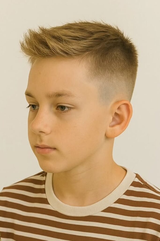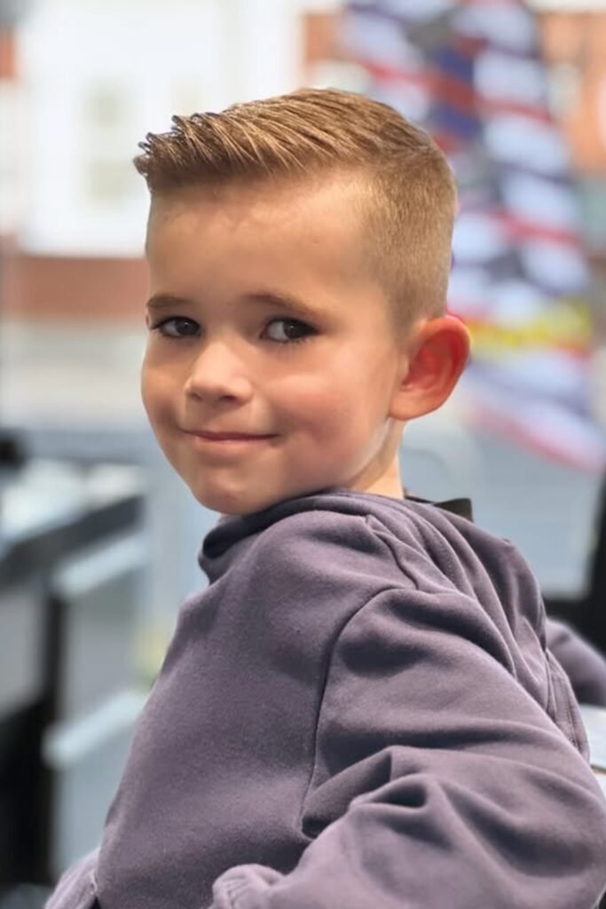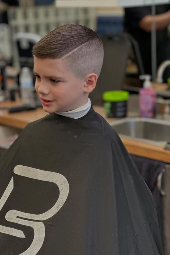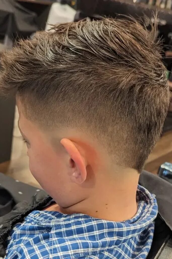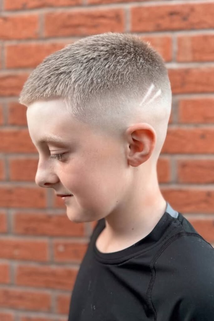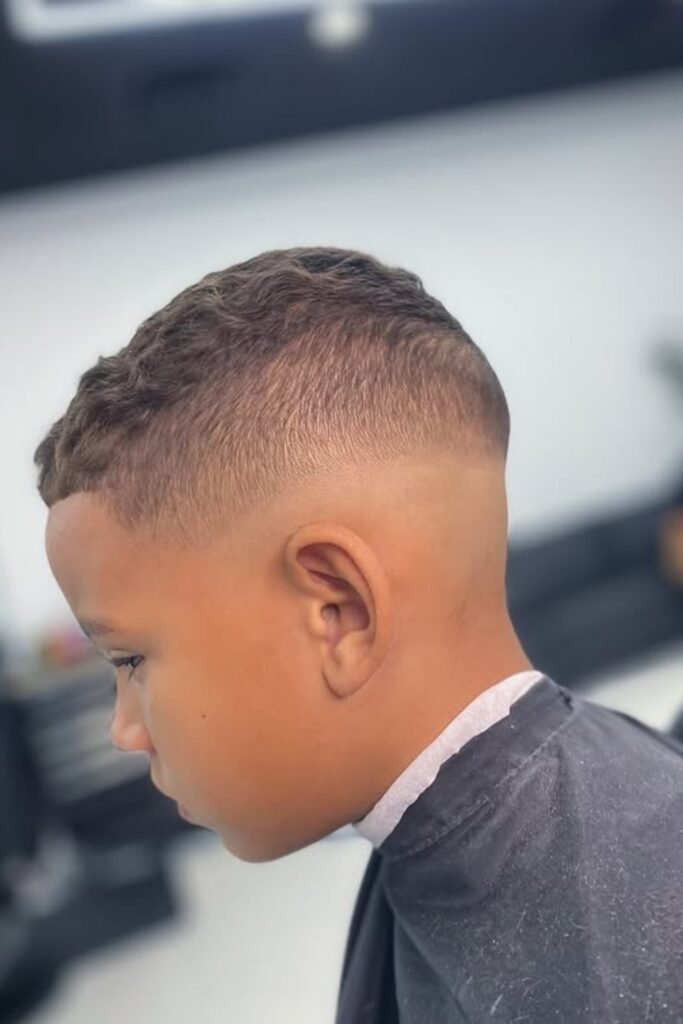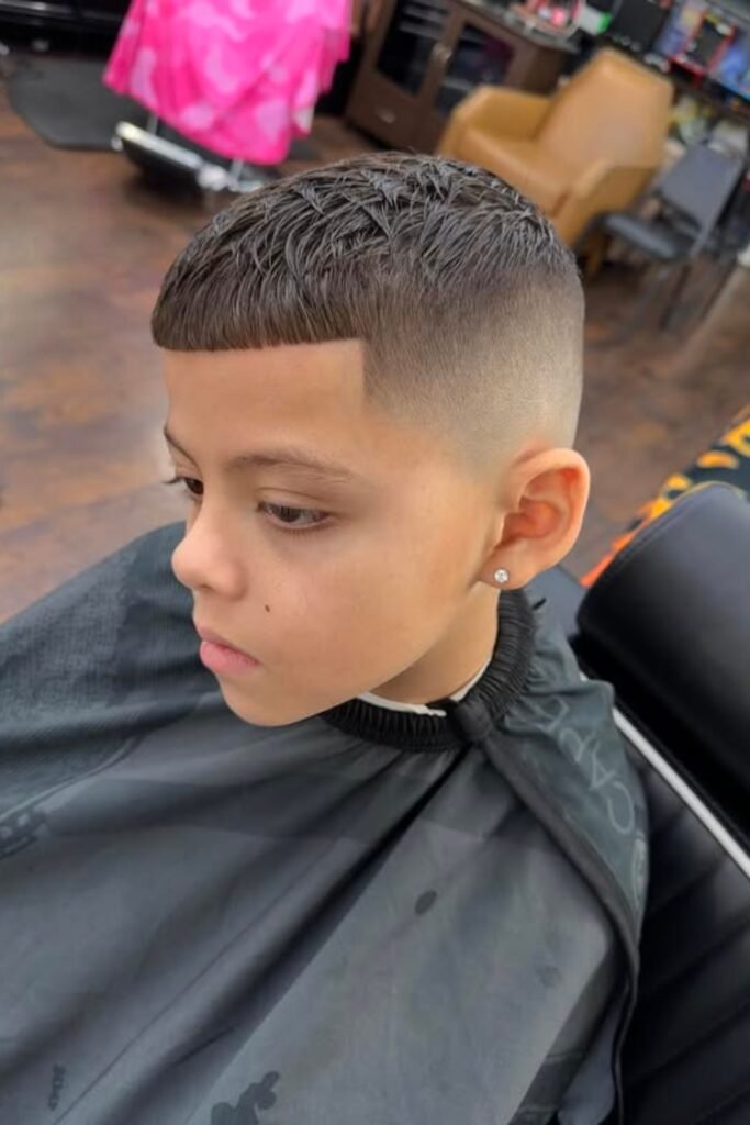 You can ask the barber for a short buzz (#3 or #4) on top with a low or mid fade, and you’ll notice it’s perfect for active kids who play sports and let you avoid daily styling.