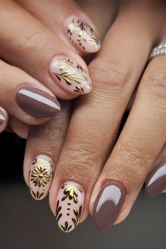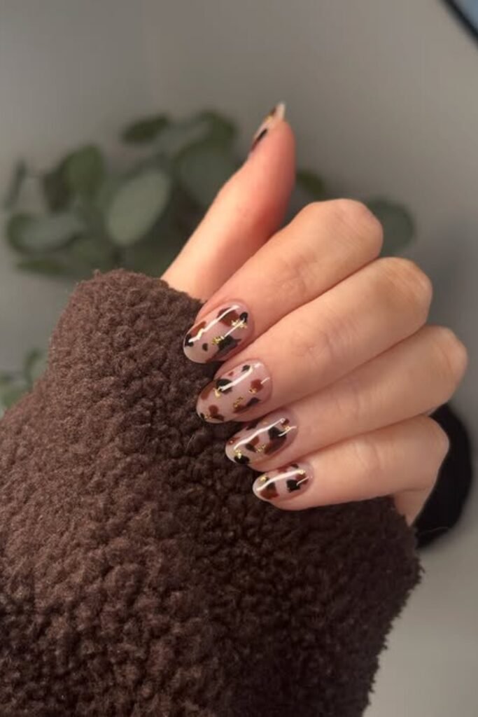 Your warm neutrals take over here with a soft nude base, chocolate-brown spots, and tiny gold foil hits that catch light without feeling flashy.