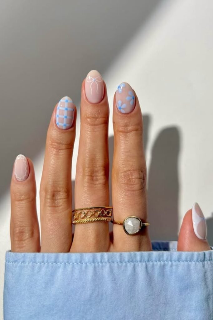 You can try gingham checks, tiny blue florals, and clean white outlines for a set that’s fun without going loud.