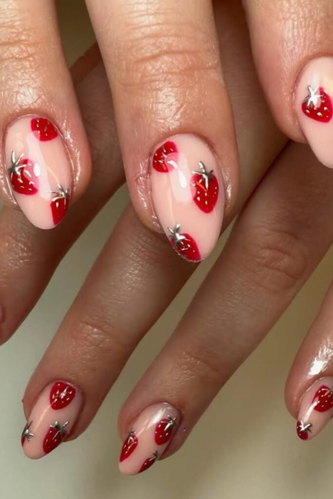 When you want instant summer mood, bright red strawberries over a milky pink base make your nails pop.