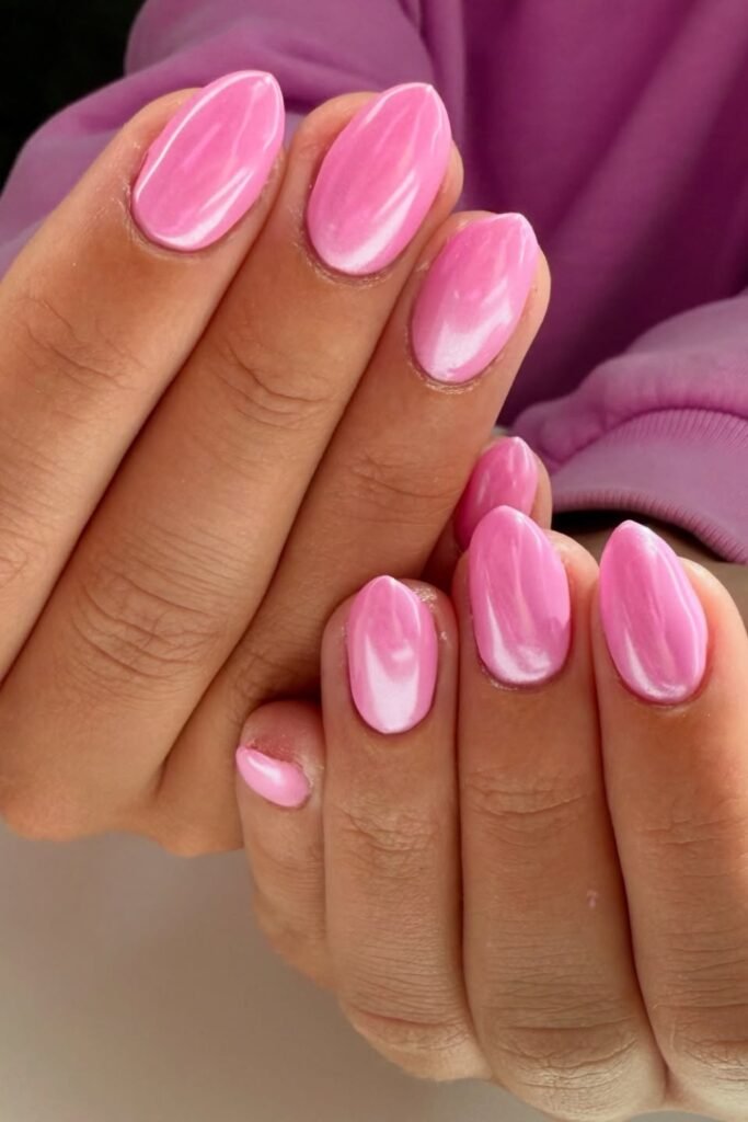 You can get clean, glossy May shine without any busy art by layering candy-pink chrome with soft white fades.