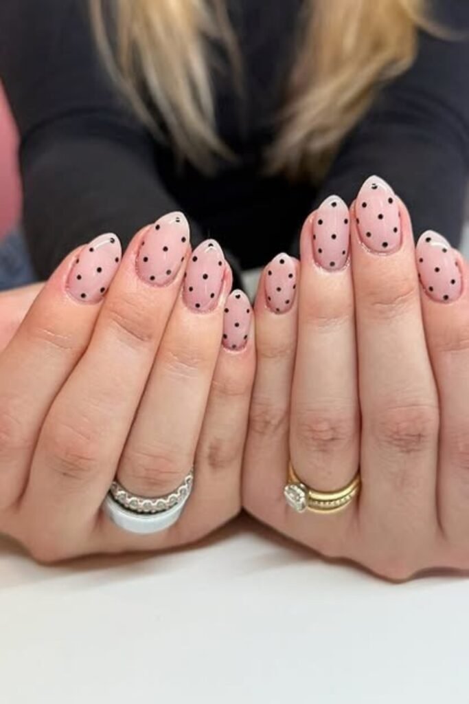 You can ask for a sheer peachy-nude base, evenly spaced micro dots in black, and keep the shape short almond so the pattern stays clean and wearable.
