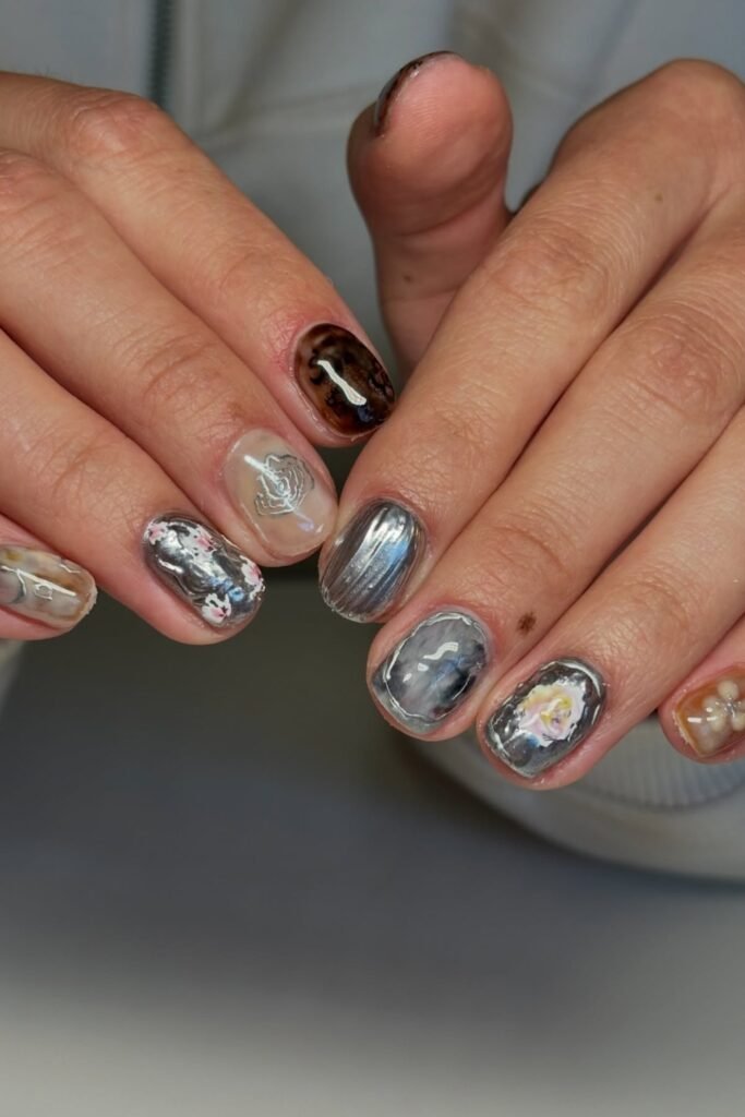For a short rounded shape, mix one chrome nail with two marble designs, and keep one soft flower accent so the set feels intentional, not messy.