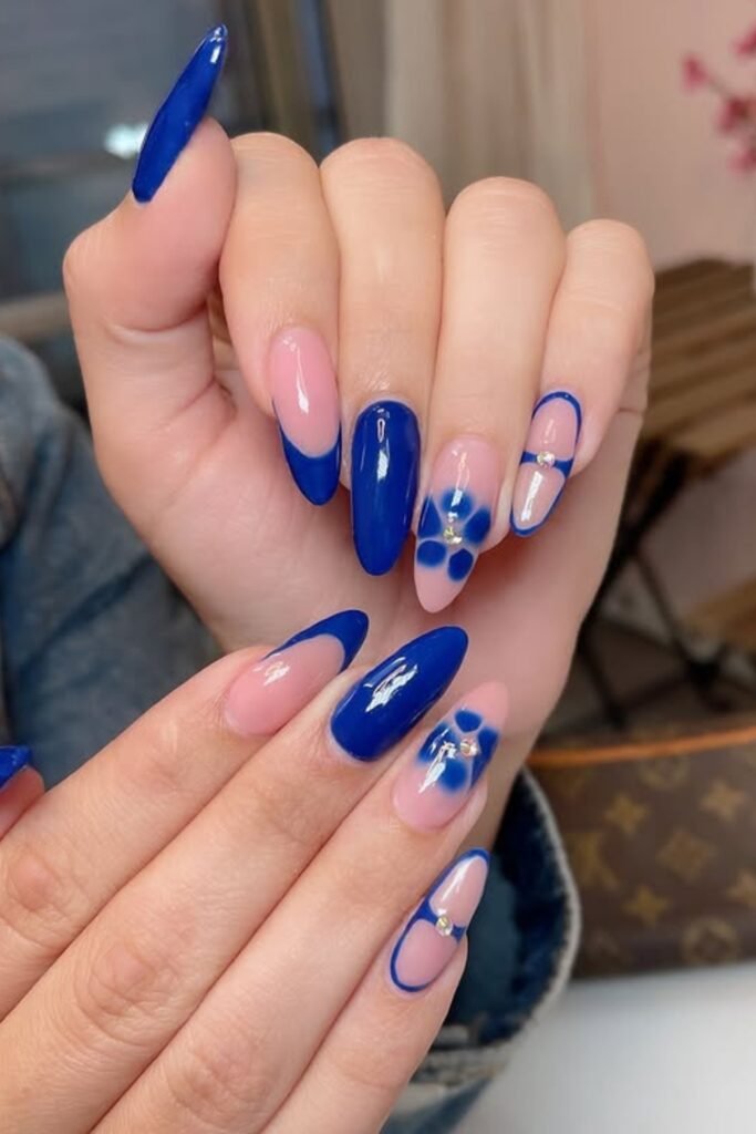 Your deep cobalt tips instantly wake up a soft pink base and make your hands stand out in May sunlight.