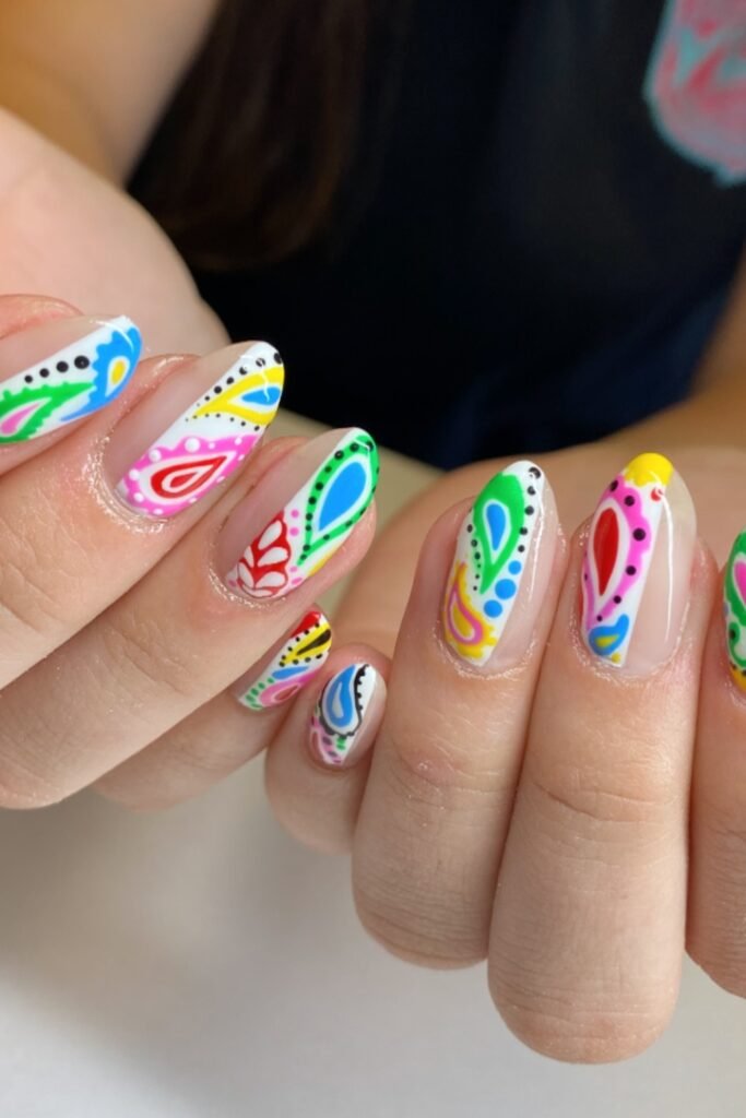 You can ask for a sheer neutral base, hand-painted paisley drops in bold summer shades, and fine black dot details to tie everything together without making it messy.