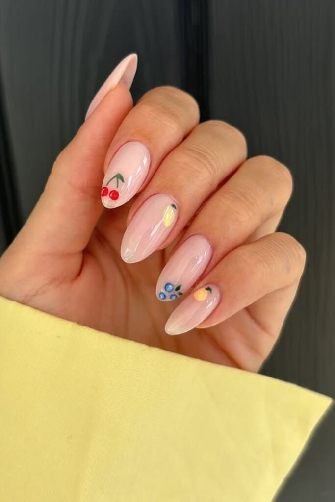 For a sheer milky pink on almond nails, then add scattered micro fruit on two or three fingers only so the design stays sweet, not crowded.
