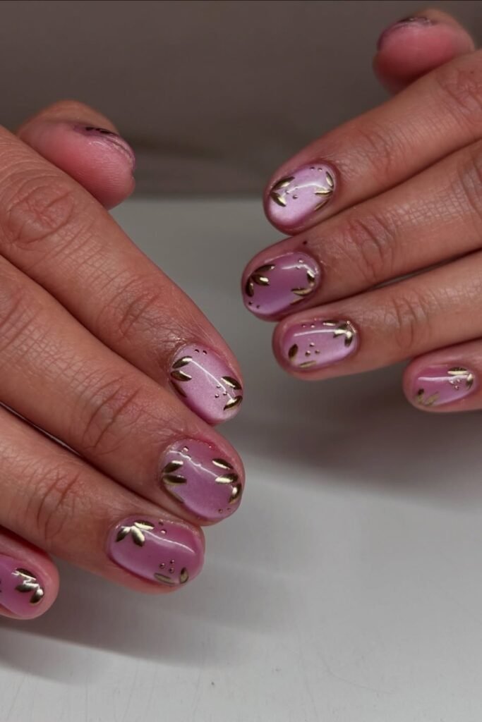 You can let soft rosy chrome catch the light first, then watch tiny gold leaf details sneak in to lift the whole set.