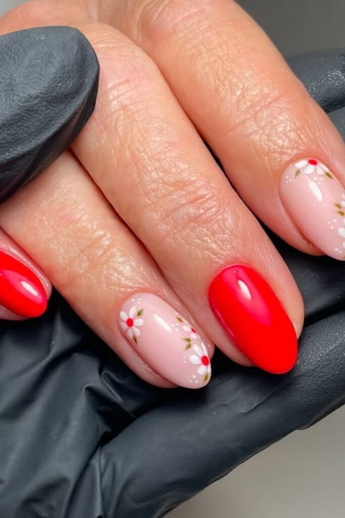 If you want instant energy on your nails, bright red brings the pop, while nude floral accents keep the set from feeling too heavy for May.