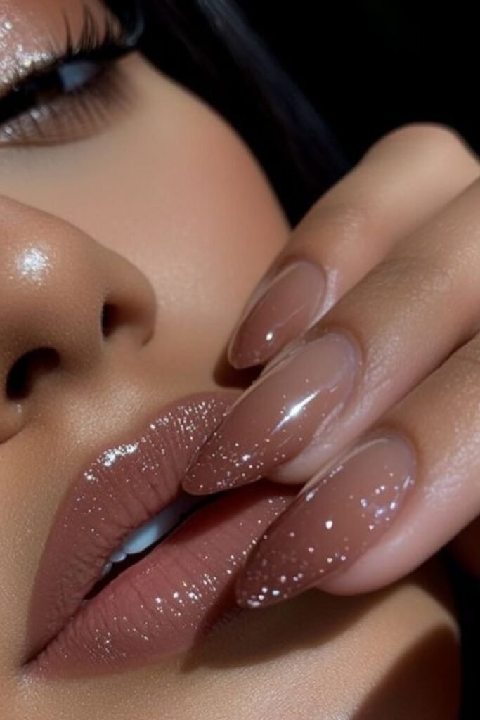 You can ask for long almond nails, a sheer mocha base, and a dusting of micro shimmer sealed under a high-gloss top coat so the glow stays smooth.