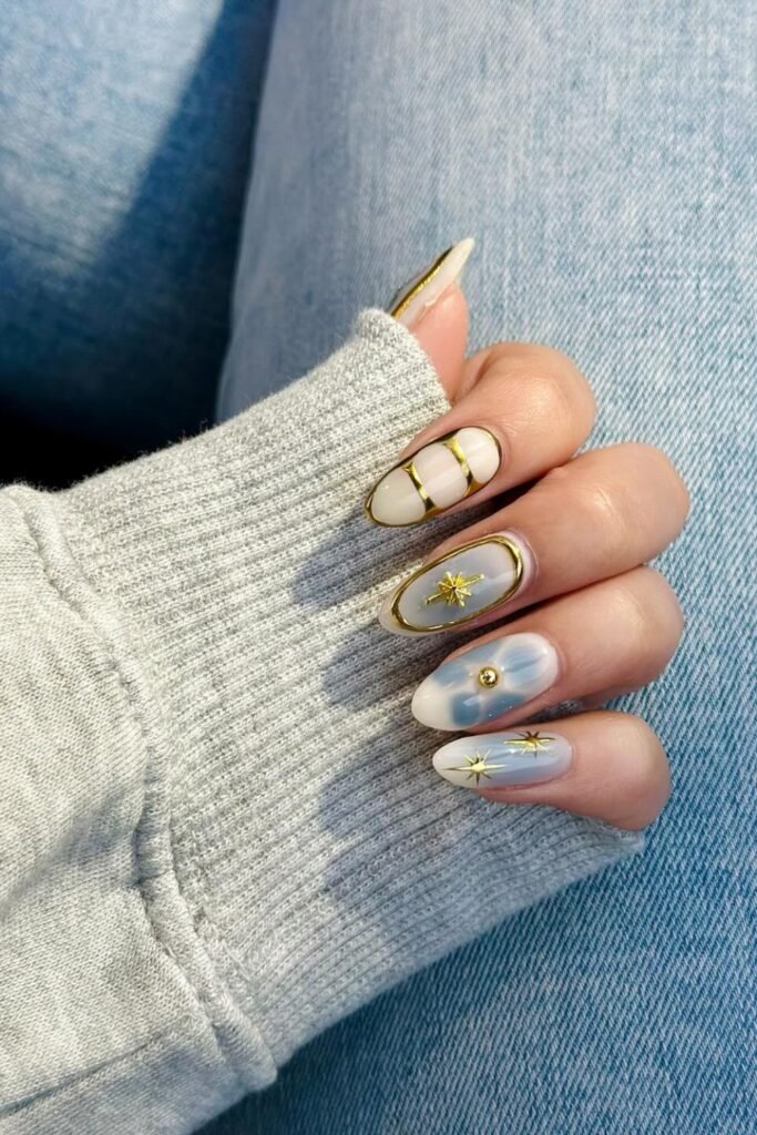 Your soft milky nails turn dreamy once tiny gold stars, clean outlines, and a cloudy blue accent step in.