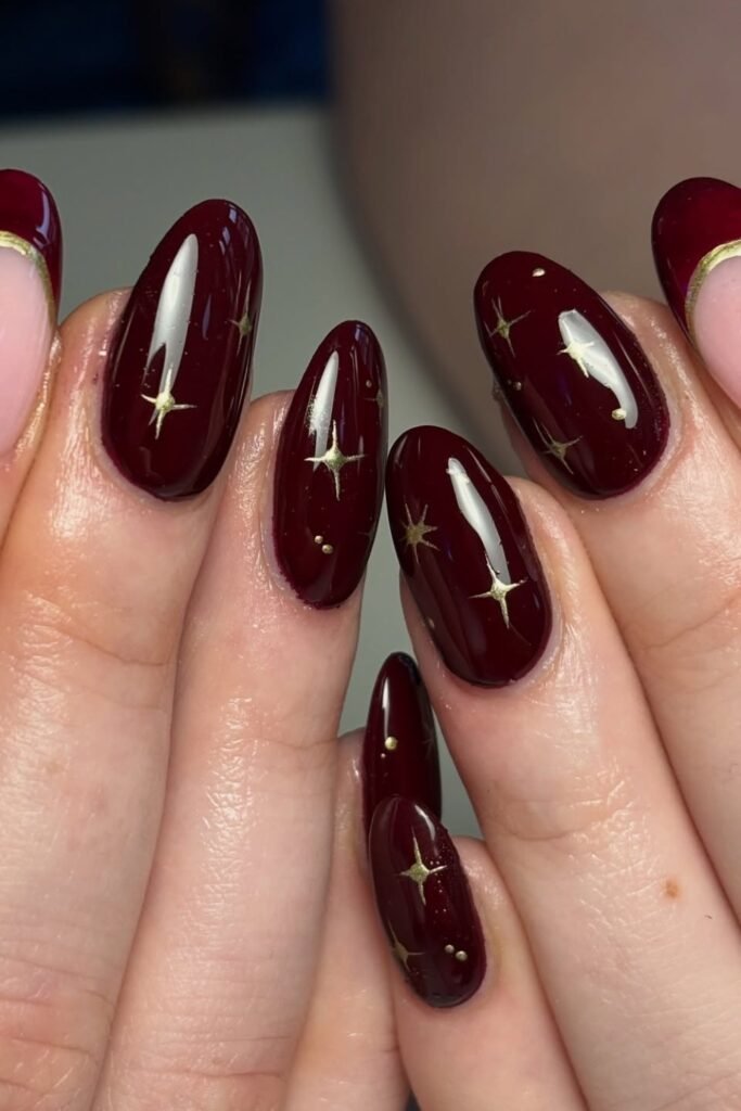 If you want drama that still feels polished, deep cherry red takes a softer turn when tiny gold stars and blush accent nails are added.