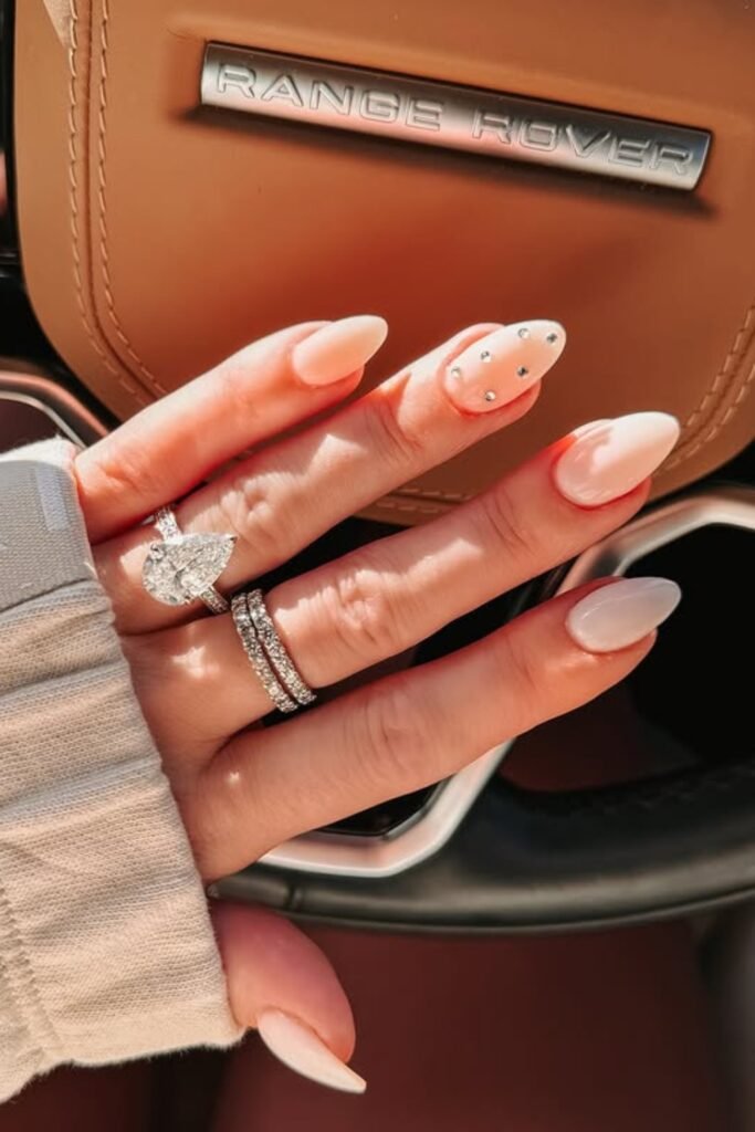You can give soft nude almond nails a quiet luxury upgrade with tiny crystal accents placed on just one feature nail.