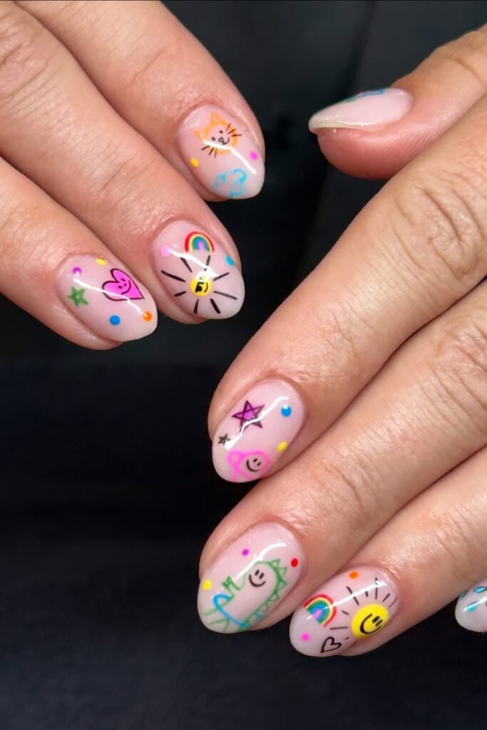 When you want nails that feel light and fun, not serious or polished, tiny rainbows, smiley faces, stars, flowers, and clouds over a sheer pink base bring happy May energy.