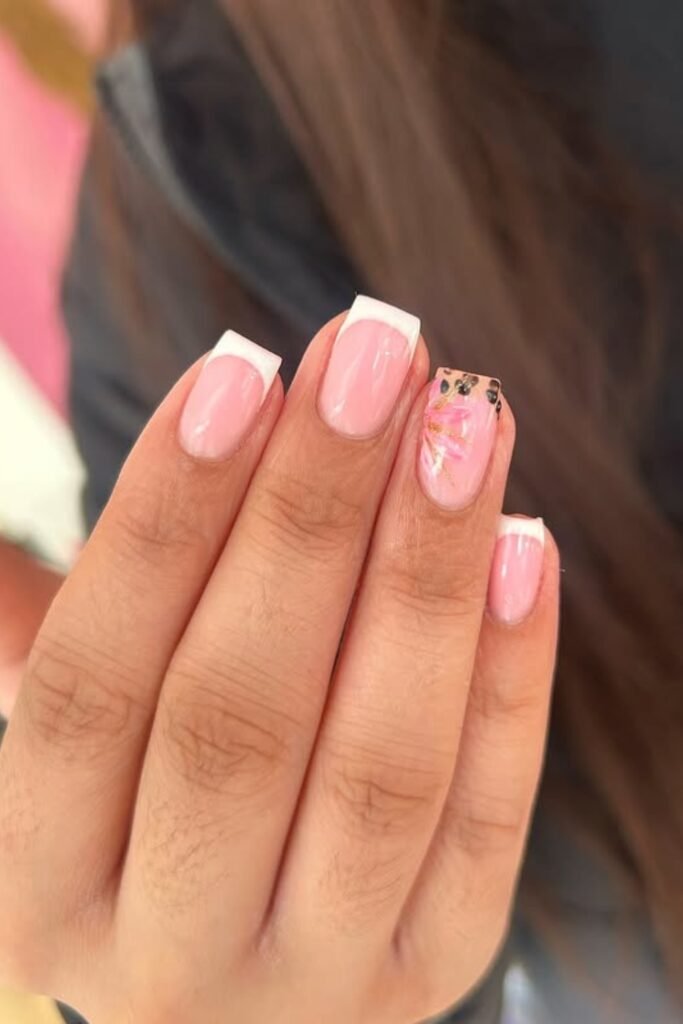 You can ask for a soft square shape, sheer pink base, crisp white tips, then add leopard spots over a pink foil accent on one nail only.