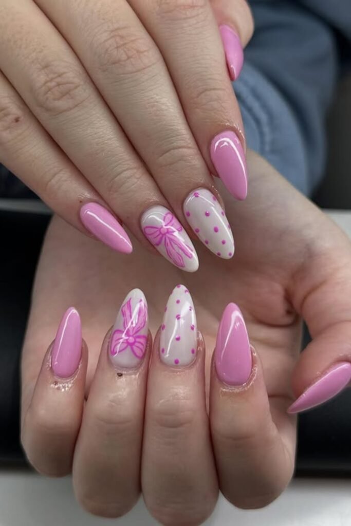 If you want something cute for daytime plans that still feels special for photos, soft pink almond nails with a butterfly and polka accent wake the whole set up.