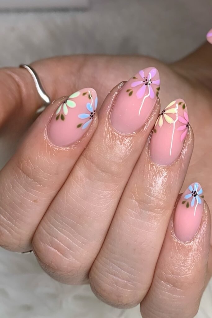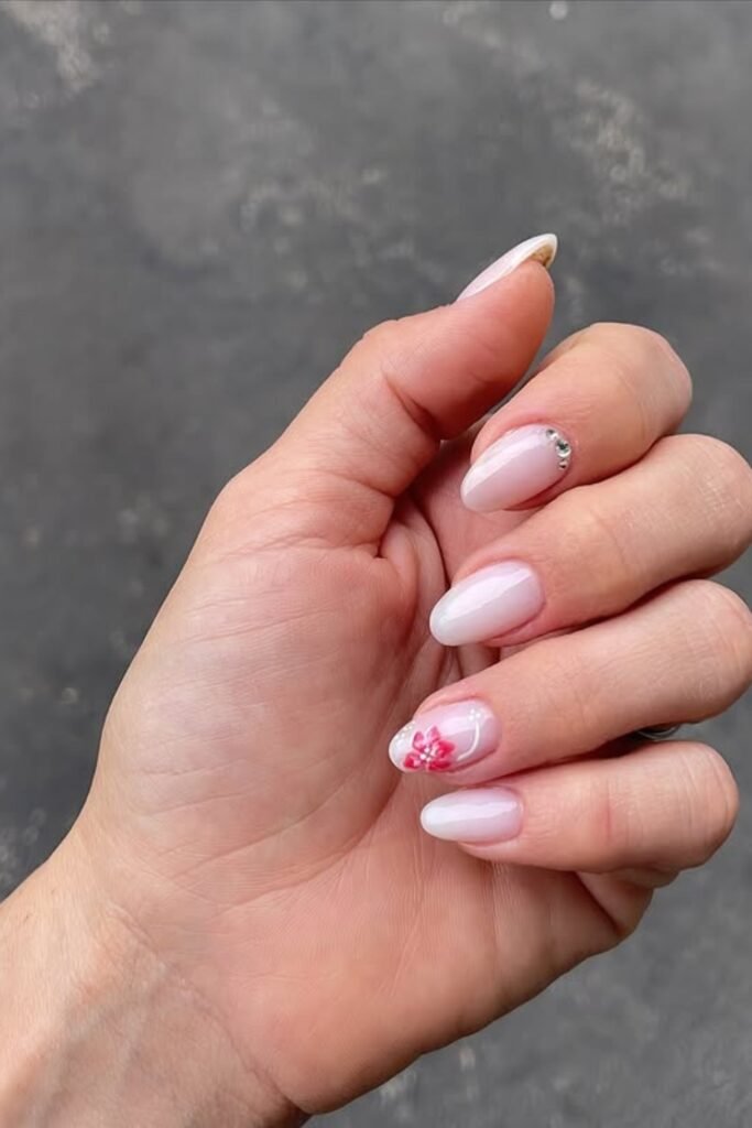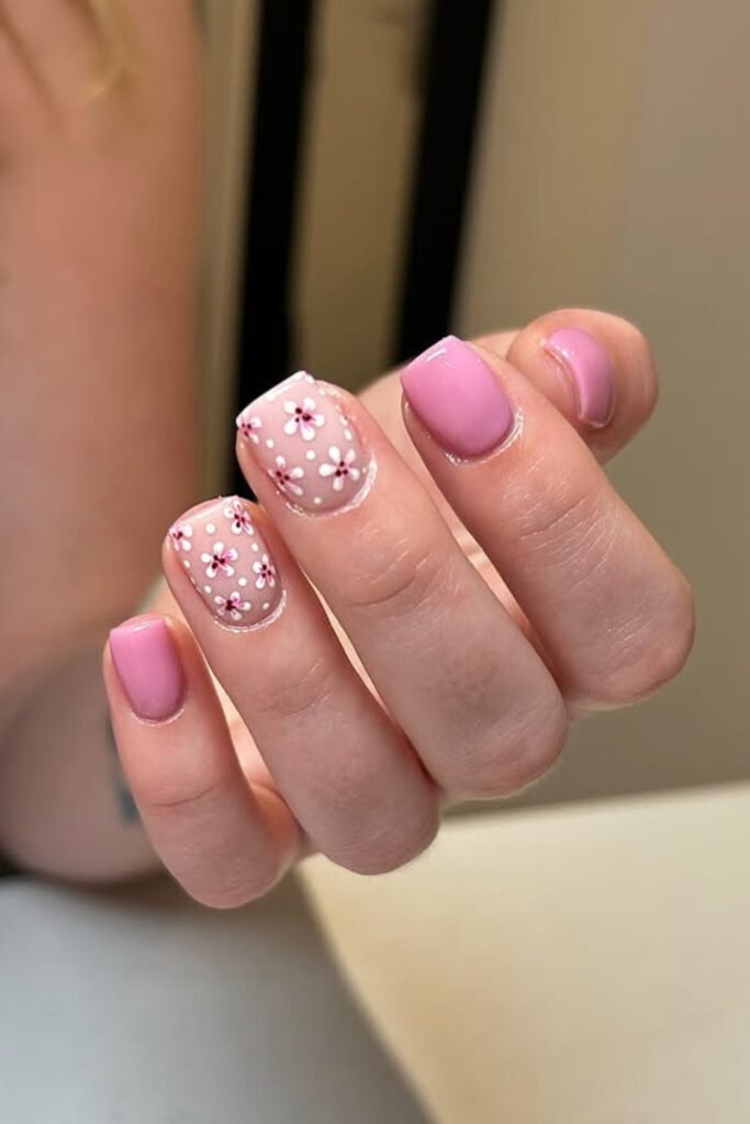 You can keep blush pink on most fingers for everyday wear while letting two sheer floral accents add that May freshness.