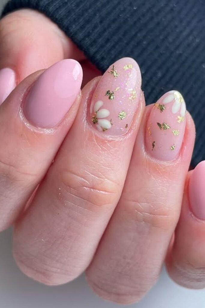 You can give light pink nails a soft upgrade by adding tiny daisies and scattered gold flakes.