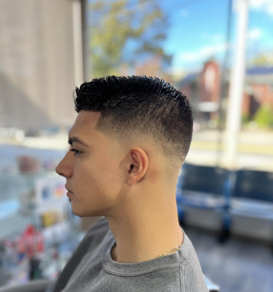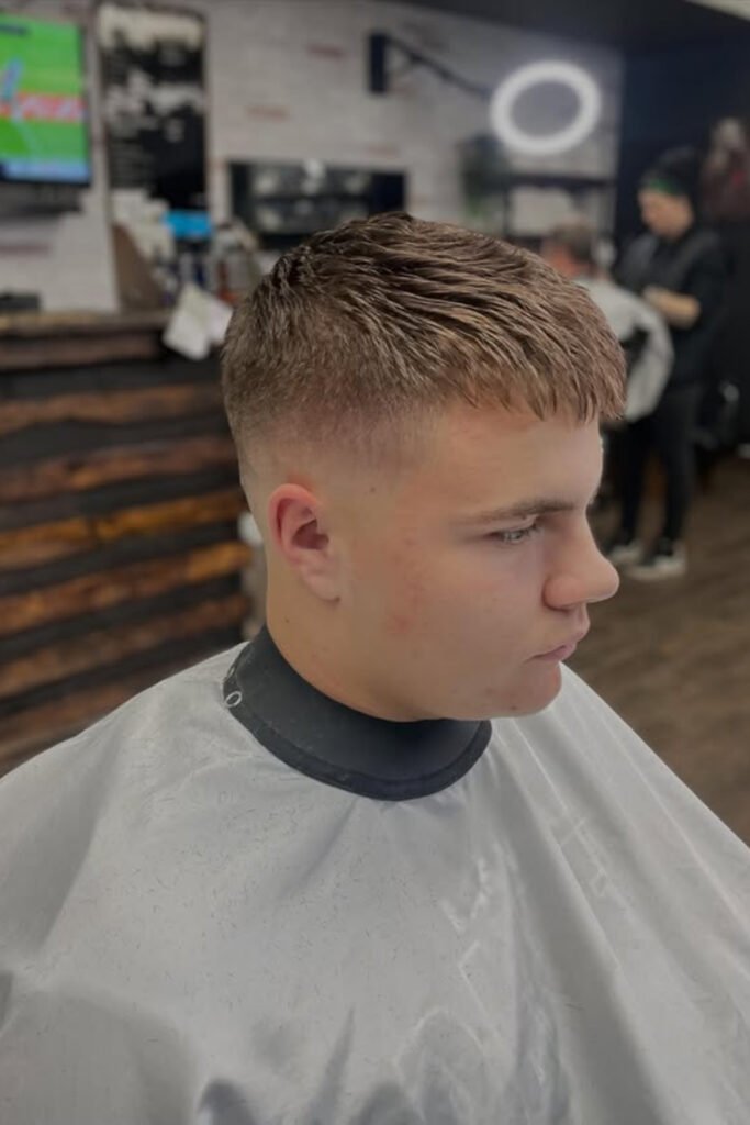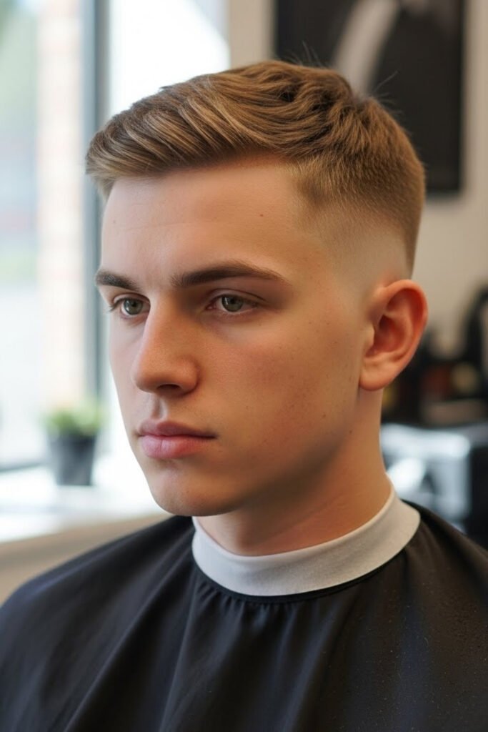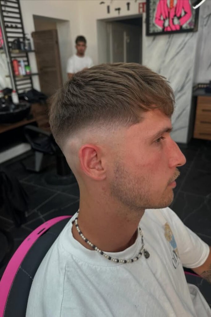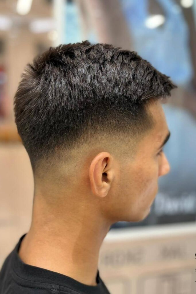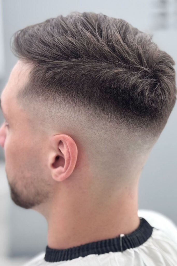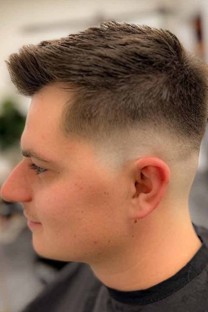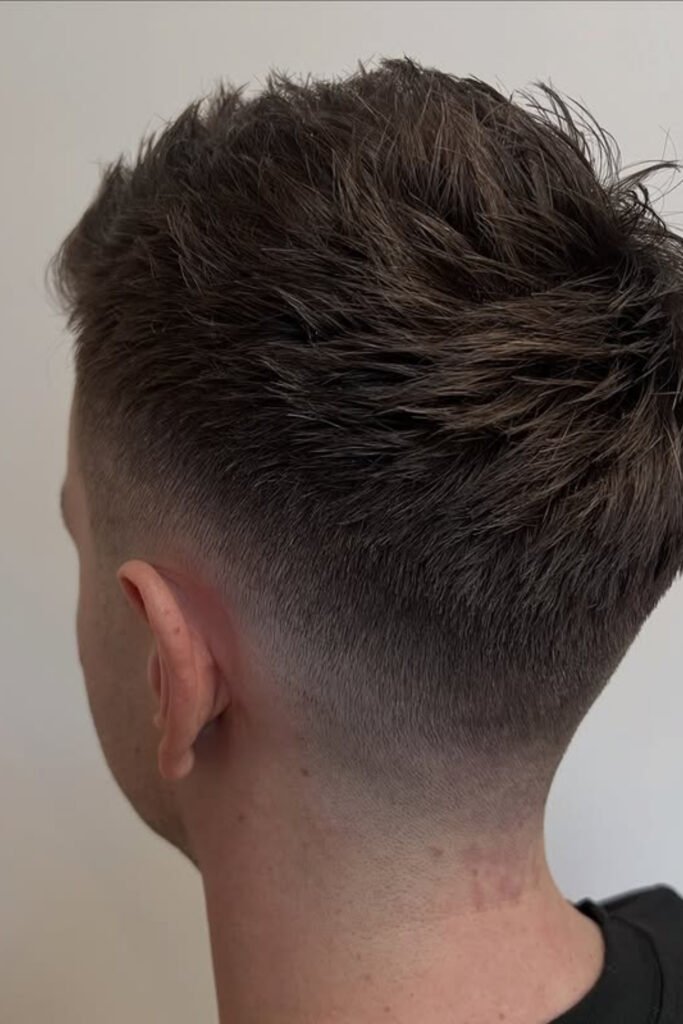 The fade drops smoothly and blends into a short, textured top, so your haircut grows out evenly instead of looking patchy.