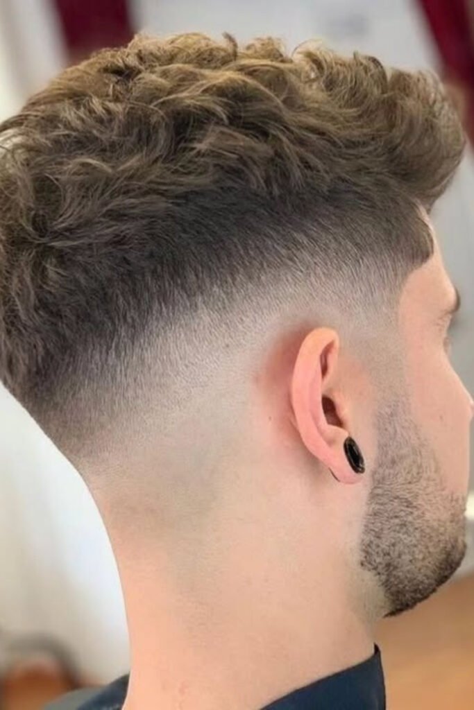 The fade keeps the sides clean and controlled, while the curly top adds volume and movement so the haircut doesn’t fall flat.