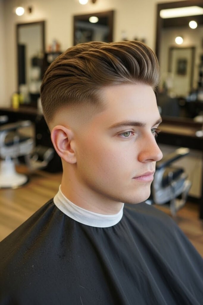 The fade stays tight and clean at the mid level, while the brushed-up top adds height and sharpness without going full pompadour.